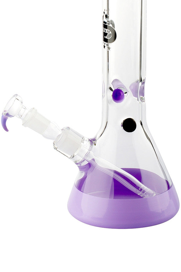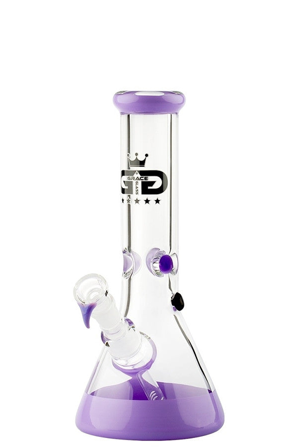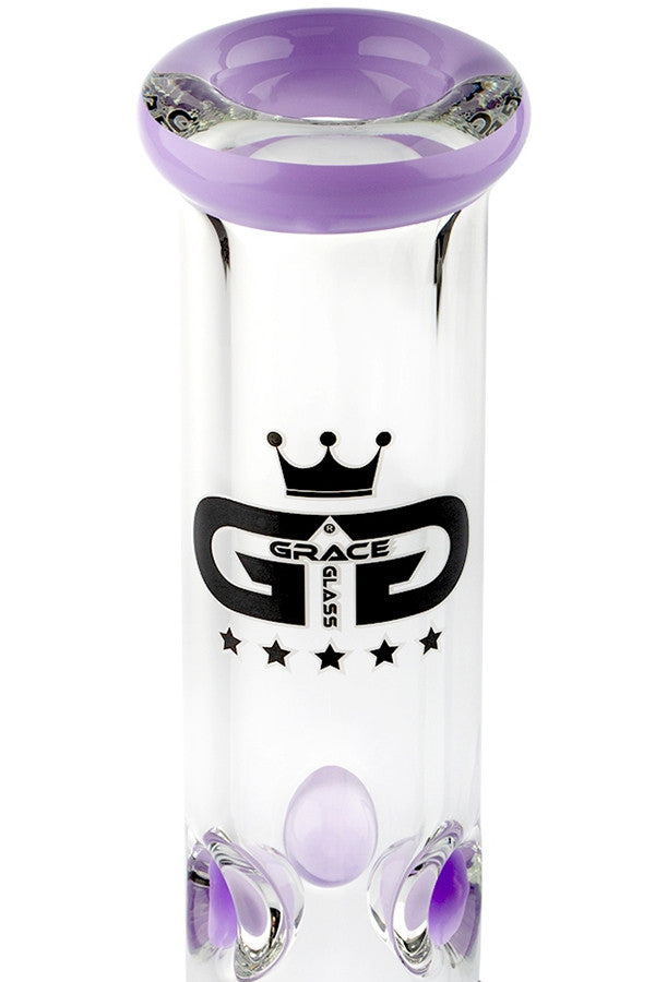 This beaker from Grace Glass stands 30cm tall and is made from 9mm borosilicate glass. It hosts a diffused downstem and an 18mm bowl/cone. The diffuser stem will create plenty of diffusion to help cool down and make the smoke smoother, it also has ice pinches which give you the added option of adding ice cubes to help cool the smoke down even further. This is a great looking piece with purple coloured highlights on the base, mouth and ice notches.