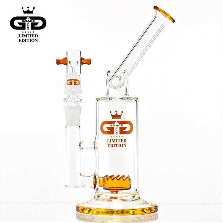 Another beautifully made oil rig from Grace Glass. Equipped with a flared mouthpiece for your comfort. Made of borosilicate glass it measures 27cm tall and come with both a flower glass bowl and a vapour dome and glass nail. Which means it can be used as both an oil rig and a normal water pipe. Decorated with matching amber glass details with the Grace Glass Limited Edition logo in Amber. A stone diffuser* to help cool the smoke for a pleasurable experience.