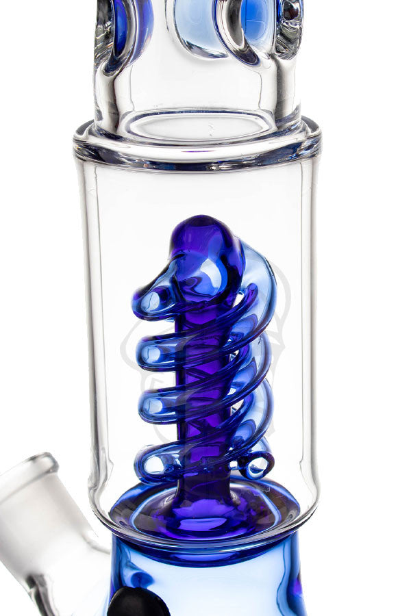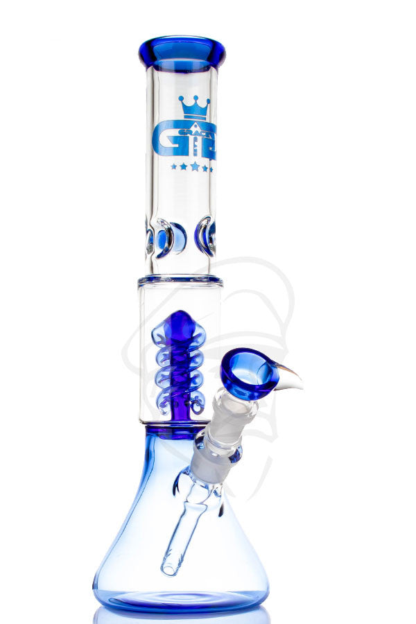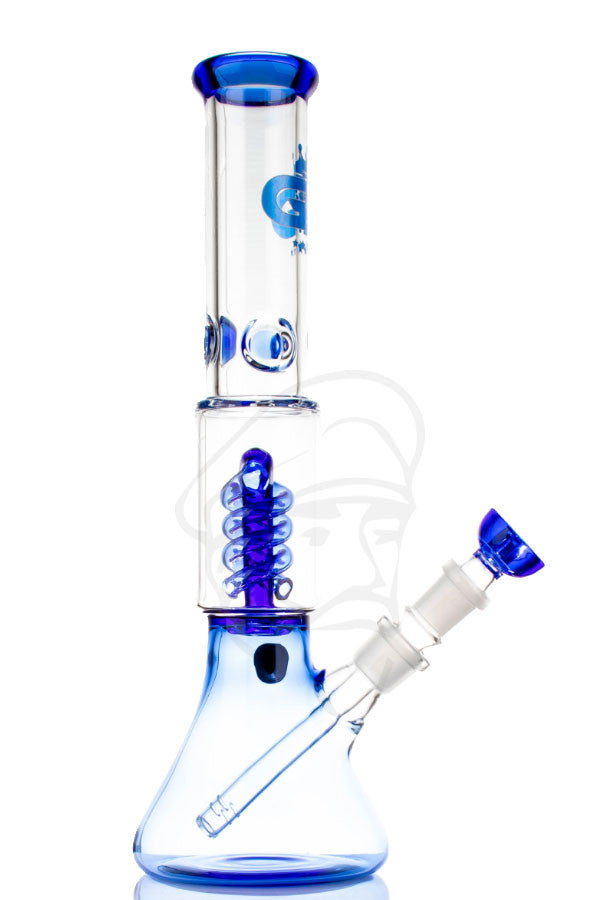 Introducing the newest addition to the Grace Glass bong collection, the Grace Glass Spiral Perc Beaker. With a height of 35cm, this bong showcases a sleek and elegant design in clear and blue glass. Not only does it have a sturdy construction, but it also features a spiral percolator, and ice notches for a smoother smoking experience. Included with the bong are a glass stem, cone, and a rubber stopper for the carb hole.