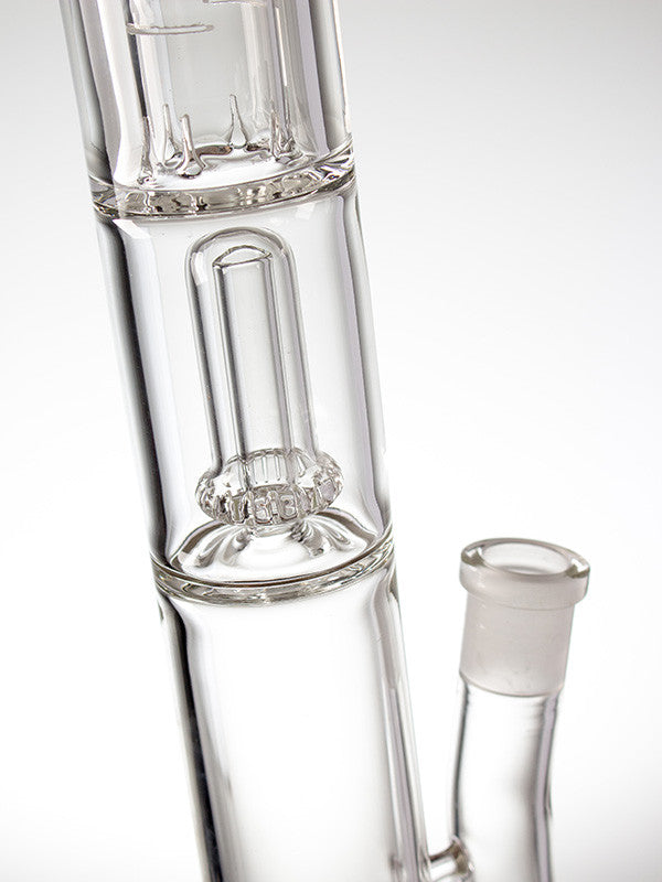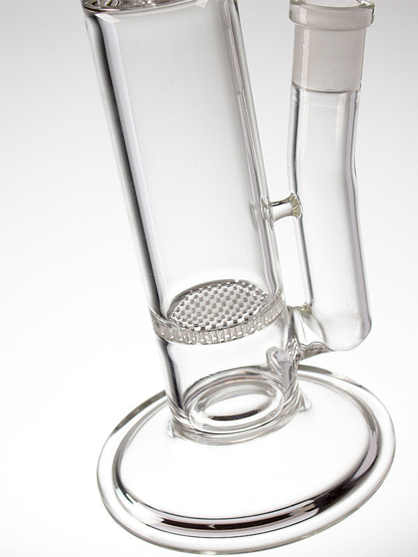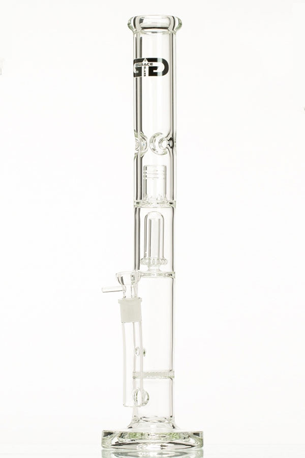 The Grace Glass UFO Perc is made out of 7mm durable heat proof borosilicate glass. Standing 52cm tall and it has a down tube diameter of Ø 50mm. Featuring a Honey Comb and UFO to help cool the smoke to create a smoother experience. It also features a dome splash guard and ice notches giving you the option to add ice cubes to further cool the smoke for the ultimate experience.