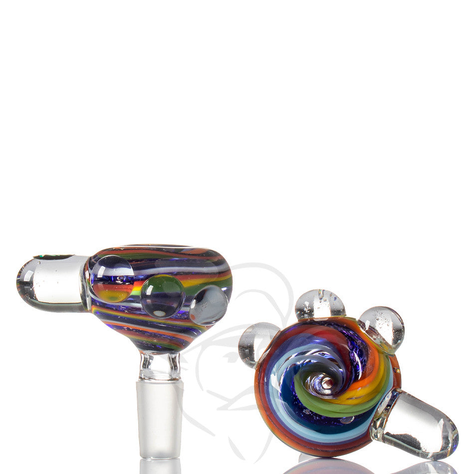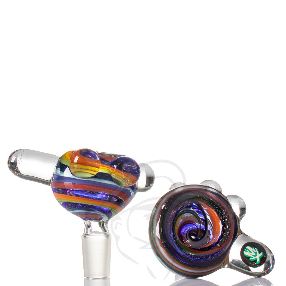 A very beautiful Californian made rainbow bowl from Mathematix, it is made from vibrant colours including dichro. It comes with a 14mm glass joint and hosts a glass handle to help with removing the bowl and also acting as a roll stop to prevent it from rolling off of surfaces.