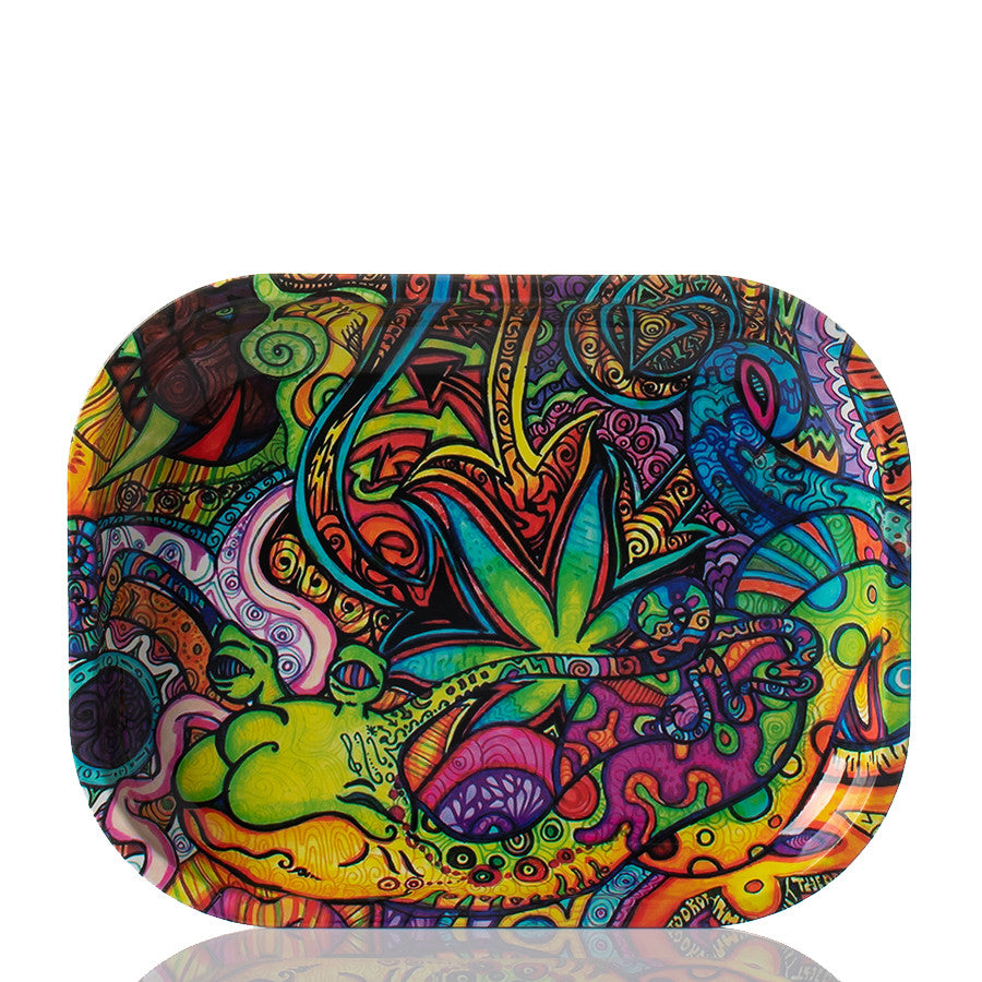 This rolling tray is is 18cm long and 14cm wide. It features colourful graphics and makes for a great accessory for the rollers among us.