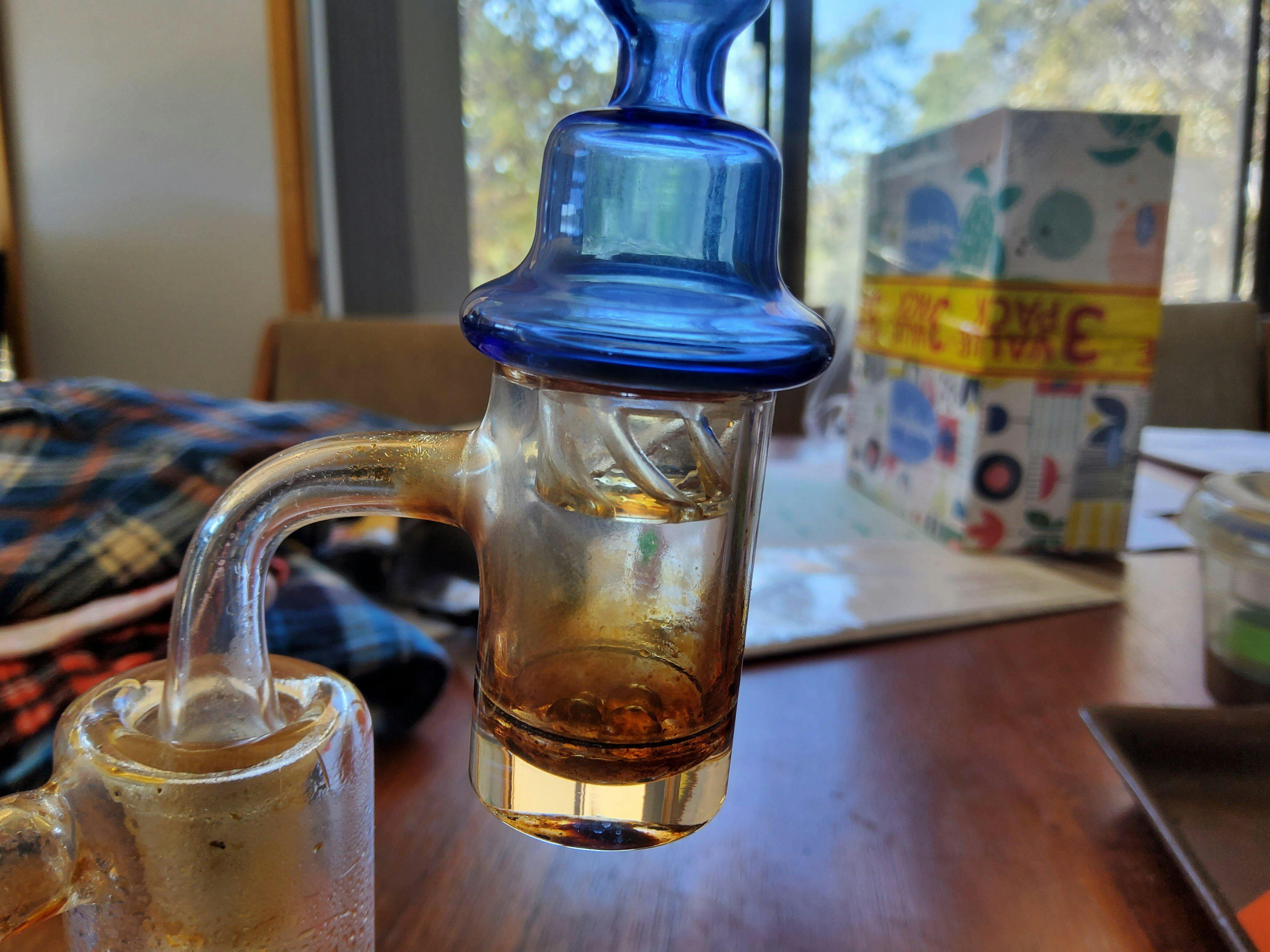 Round bottom banger, terp pearls, turbo carb cap combined equals better mixing of dab and more surface area for total consumption of All the goo.